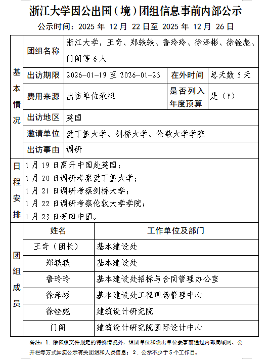浙江大学因公出国(境)团组信息事前内部公示